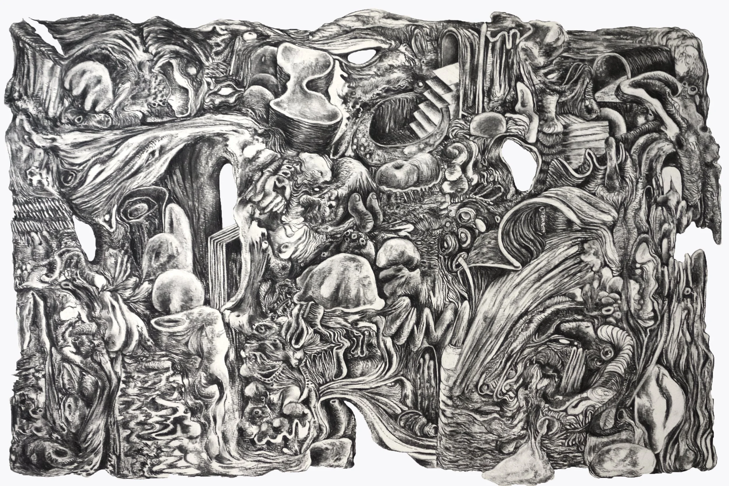 “J’imagine l’espace du monde extérieur lié à l’intériorité du corps, presque fondu. Dans l’obscurité, la fenêtre d’une maison devient un oeil, l’escalier un étroit intestin. Corps-labyrinthé.” 2020